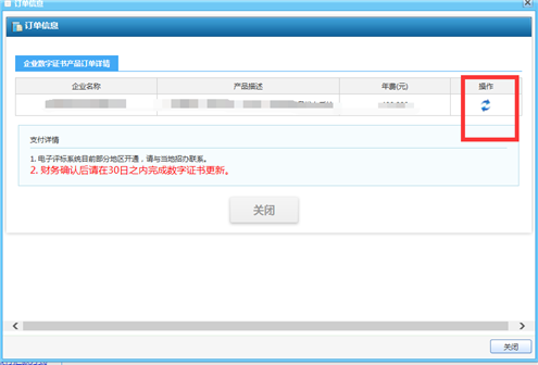 1、當(dāng)查詢到訂單狀態(tài)為【已財務(wù)確認(rèn)】時,可點擊訂單號進行在線更新CA 數(shù)字證書。注意:更新期間不可插拔證書,因插拔證書造成更新失敗的,請聯(lián)系客服處理。