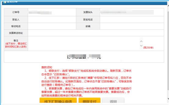 4、在彈出的頁面填寫訂單的相關(guān)信息,選擇自己認(rèn)為方便的匯款方式(銀聯(lián)匯款方式到賬后自動確認(rèn),線下匯款方式的需財務(wù)人工確認(rèn))。(圖6)