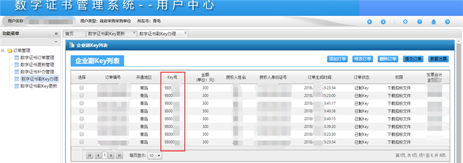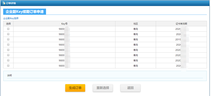3、在訂單詳情頁面可以查看已購買的副key,以及開通的地區(qū)和證書有效期,在需要更新的key號前面打鉤,點擊下方的生成訂單。(注意:下訂單務(wù)必確認(rèn)key號是否和需要更新的數(shù)字證書一致,否則將無法更新。)(圖9)