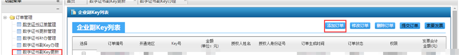 2、選擇【訂單管理】-【數(shù)字證書副Key更新】,點擊右上角的【添加訂單】按鈕。(圖8)