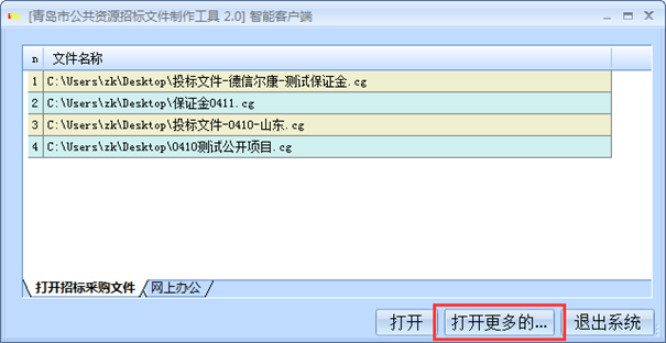 雙擊桌面上“青島市投標(biāo)文件編制工具2.5”快捷方式(其他地區(qū)操作方式一致,打開不同的客戶端即可),進(jìn)入首頁。點(diǎn)擊打開更多→選擇下載的電子版招標(biāo)文件(ztb、cg、ztb13)→打開。(初始紅色CA鎖天威盾密碼為12345678,初始紫色CA鎖PIN碼為111111)