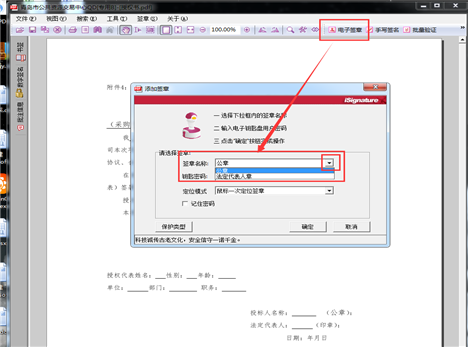 簽完公章后,再簽法人章。在同一文件上,再次點(diǎn)擊“電子簽章”按鈕,選擇法人章,并將章放置到相應(yīng)的位置。