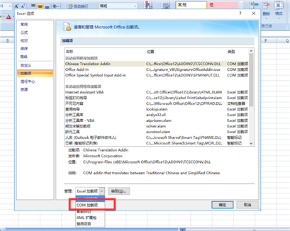 Excel選項(xiàng)中選擇加載項(xiàng),管理的位置選擇COM加載項(xiàng),點(diǎn)擊轉(zhuǎn)到